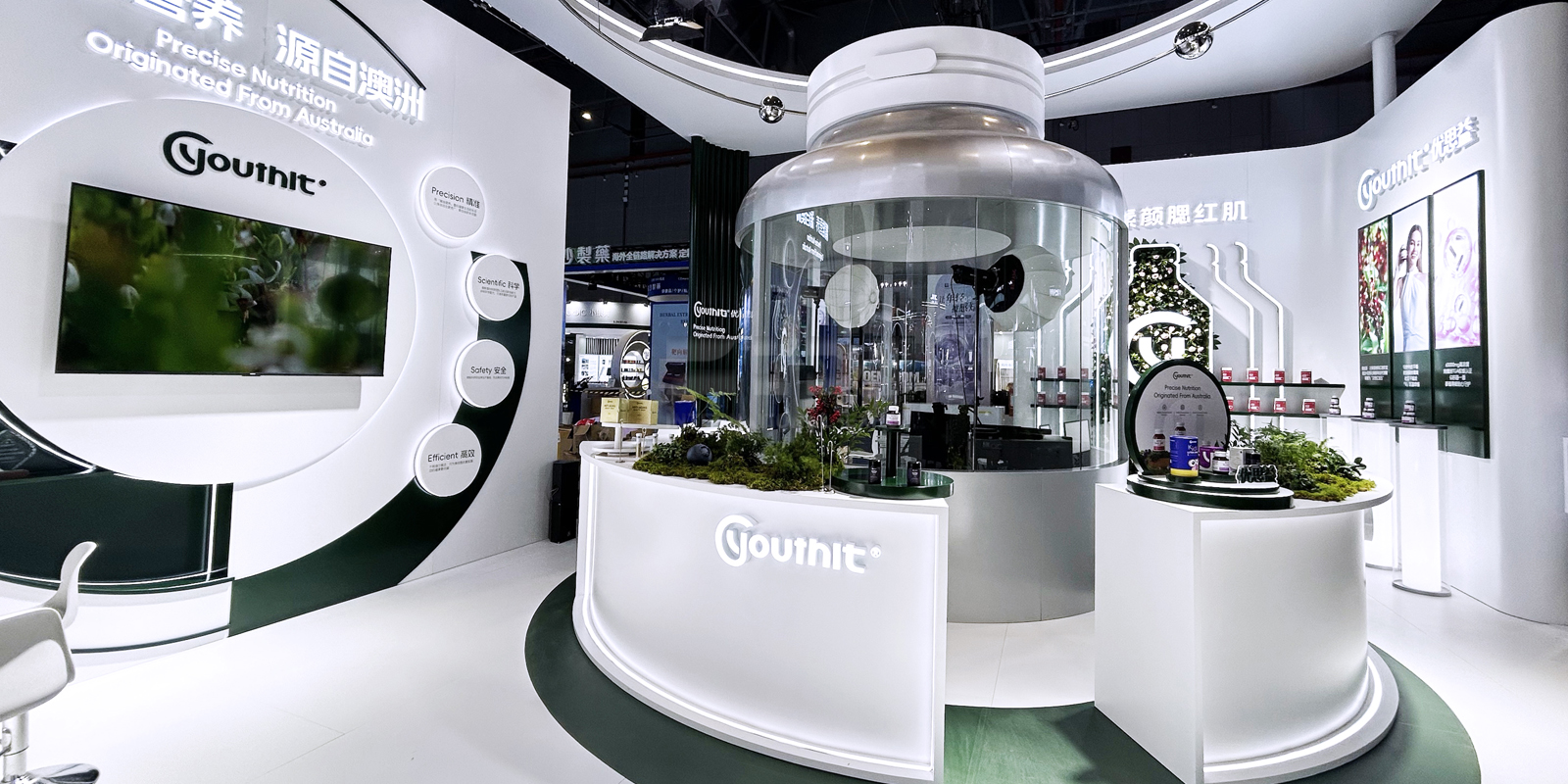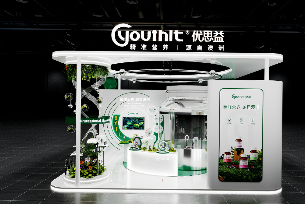 本次優(yōu)思益展臺(tái)以品牌理念“精準(zhǔn)營養(yǎng)·源自澳洲”為核心,打造出一個(gè)融合科技感與自然感的沉浸式空間。整體設(shè)計(jì)以純白與森林綠為主色調(diào),傳遞健康、純凈與科學(xué)的品牌基因;并以環(huán)形結(jié)構(gòu)與流線布局,象征精準(zhǔn)營養(yǎng)的循環(huán)體系與品牌持續(xù)守護(hù)健康的理念。